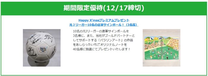 Happy X’masプレミアムプレゼントとして、「元Jリーガー10名の直筆サインボール」 が3名に当たります