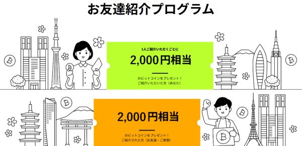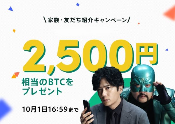 ・以下の紹介リンクから口座開設、本人確認を完了すると、2,500円分のBTC(ビットコイン)がもらえる