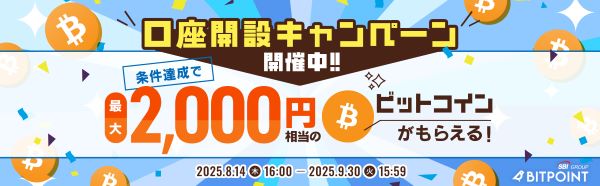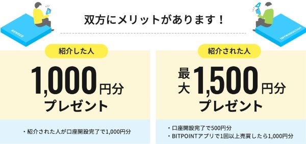 以下の紹介リンクから口座開設してBITPOINTアプリで暗号資産を1,000円以上購入すると、両方のキャンペーン条件を満たす為、3,500円分の暗号資産がもらえます。