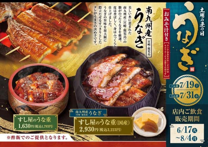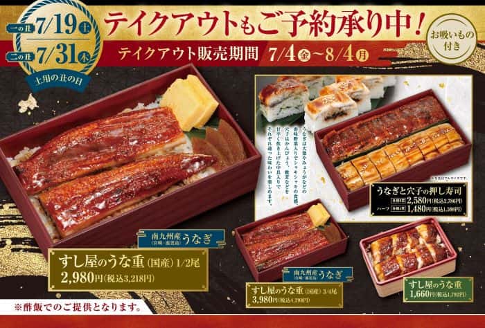 またイートインメニューの販売開始に併せて「すし屋のうな重(国産)」「うなぎと穴子の押し寿司」などのテイクアウトのご予約受付を開始します。