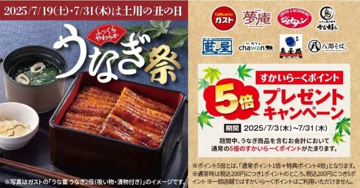期間中、対象のうなぎ商品を含む​お会計の際に「すかいらーくアプリ」で、​すかいらーくポイントをご提示いただくと、​通常200円(税込)ごとに1ポイントのところをキャンペーン期間中は5倍ポイントを進呈します。