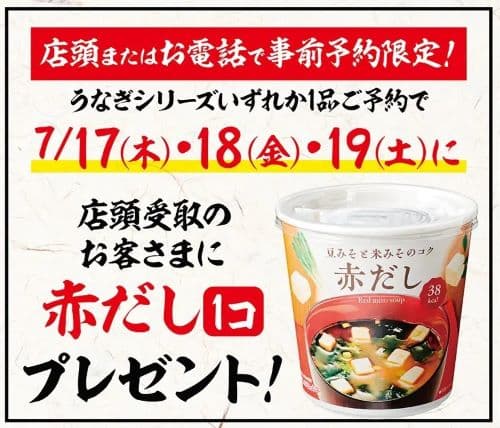 また、各種うなぎメニューをご予約のうえ、7月17日(木)・18日(金)・19日(土)の期間に店頭受取でご予約いただいた方限定で、「赤だし」1個をプレゼントします。
