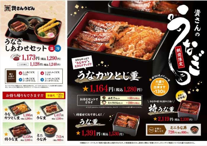 株式会社資さんは、「うなぎ」メニュー各種を販売します。
