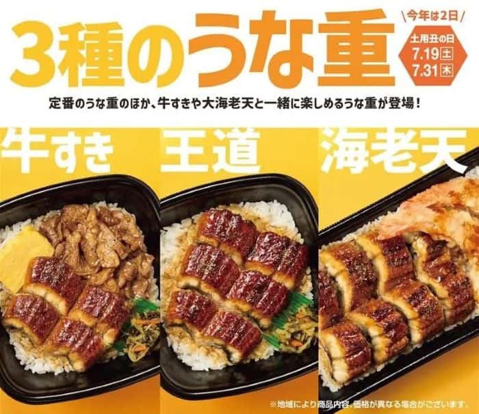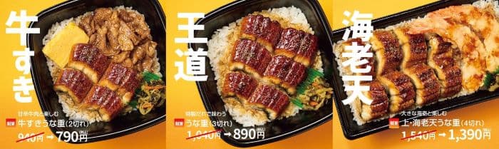 ほっともっとは、「うな重」「牛すきうな重」「上・海老天うな重」を販売します。