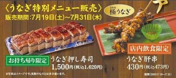 コロワイドグループの株式会社アトムは、回転寿司業態の「にぎりの徳兵衛」「海鮮アトム」の各店で、イートイン限定の「すし屋のうな重(国産)」などを販売します。
