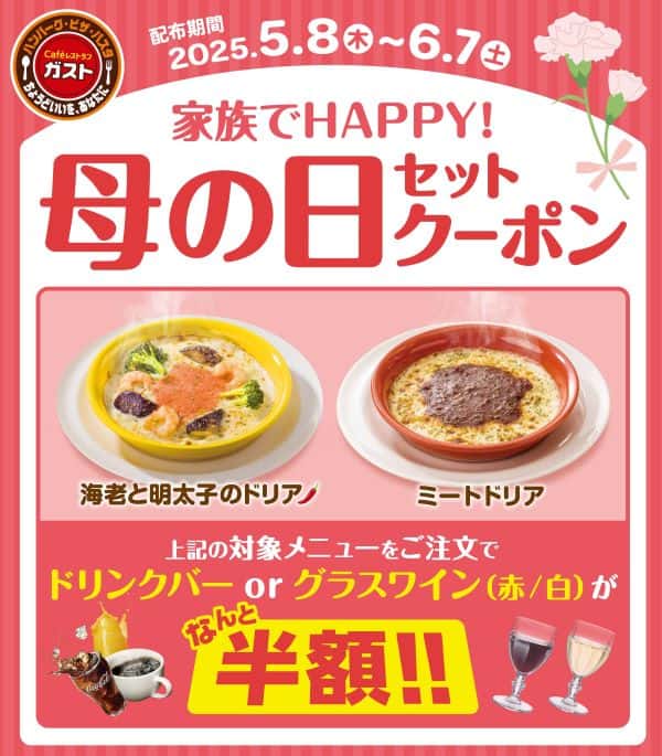 「母 の 日」がお得な飲食チェーンのクーポンやキャンペーン情報などをご紹介しました。
