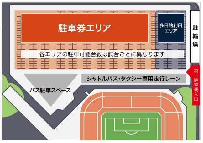 試合開始15分後を目安に第1駐車場のエリア規制を解除。解除後は空きがあれば駐車できます。