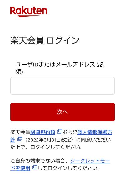 「RakutenMobile年齢確認をする」を選択すると、楽天会員のログイン画面に移動します。