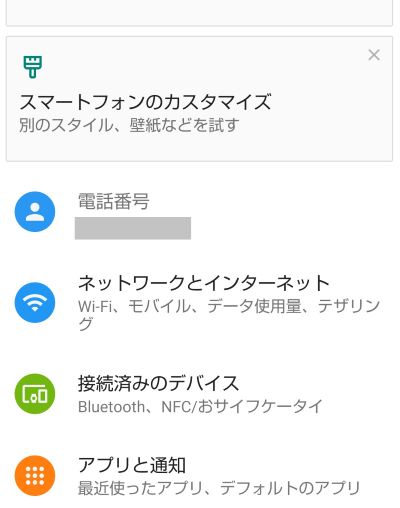 設定アイコンから電話番号の項目を探して、電話番号を確認します。
