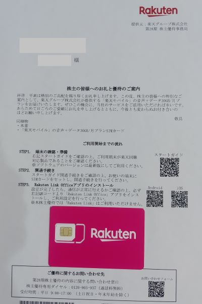 株主優待の内容は、「楽天モバイル」の音声+データ30GB/月プランを1年間無料というもの。