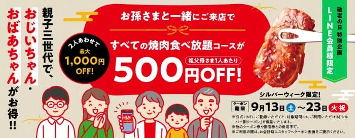 対象条件:お孫さまと一緒に来店された祖父母さまを対象に、すべての食べ放題コースを1人につき500円OFF(最大2人で1,000円OFF)