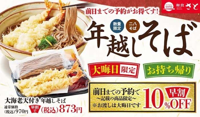 全国199店舗を展開する「和食さと」では、今年も大晦日限定でお持ち帰り専用の「年越しそば」を数量限定で販売します。今年は定番の石臼挽きそば粉の香り豊かな二八そばに、豪華天ぷらをセット12月3日(火)からアプリモバイルオーダーでの事前予約受付を開始します。